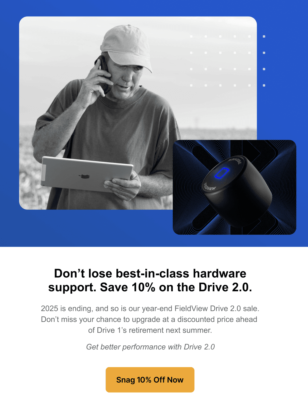 This post was part of the Drive 1 retirement campaign, in which FieldView discounted the new Drive 2.0 in anticipation of the Drive 1 being retired. Posted during December, this satisfying post encourages our audience to take advantage of the sale.